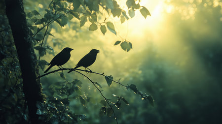 Silhouetted birds perched on a branch amidst misty forest greenery during golden hour light