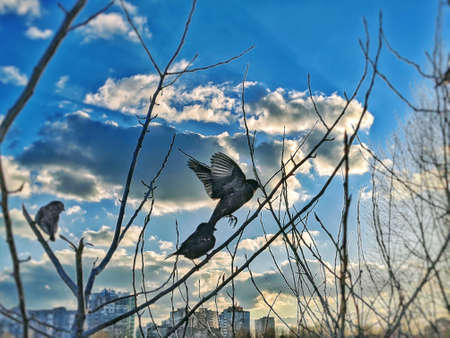 black crows fly off a tree against a background of blue sky with clouds