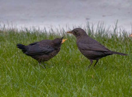 Portrait of two blackbirds with an earthworm in its beak standing in the grass