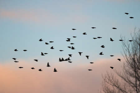 A flock of starlings is flying in the sunset sky. A flock of starlings in flight.