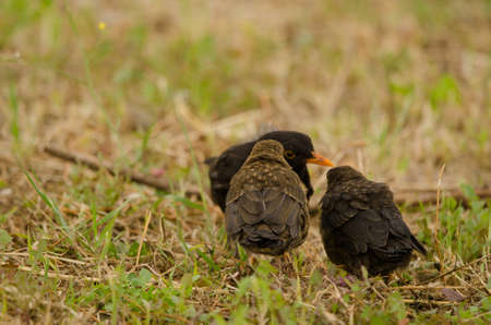 Common blackbirds Turdus merula cabrerae. Male with chicks. Las Palmas de Gran Canaria. Gran Canaria. Canary Islands. Spain.