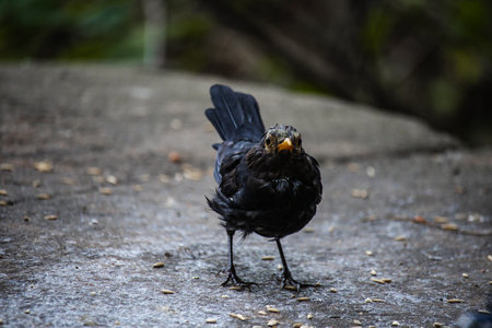 Detailed close-up of a common blackbird, highlighting its sharp beak and glossy black plumage
