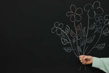 Woman near blackboard with chalk drawn bouquet, closeup. Space for text