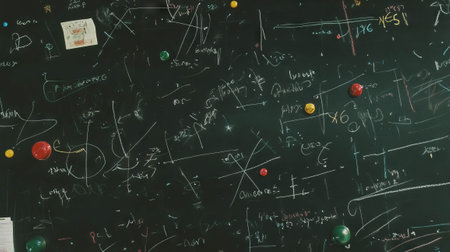 Chalkboard texture with handwritten formulas and colored magnets for math education design