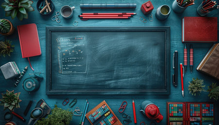 Back to school, blackboard layout and accessories vivid colorful. Copy space