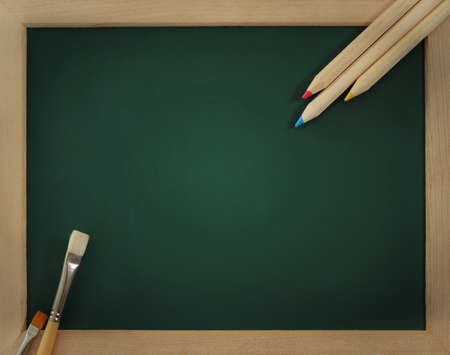 Green clear blackboard with brushes and pencils
