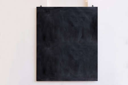 Blackboard sign hanging on white wall background. Black blank board, school education sign, template for message, copy space