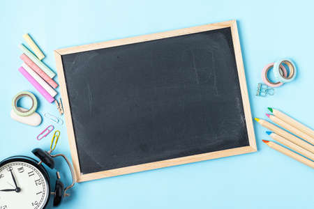 School chalkboard and stationery accessories, pencils and pens. Back to school concept, top view, blue background