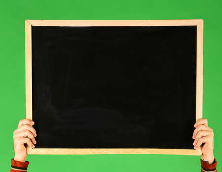 Male hands hold blackboard on green background. Chalkboard with empty space in guys hands, copy space. Advertisement and presentation concept