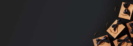 Black friday concept with craft package with black bow and ribbon, top view, copy space, flat lay, banner