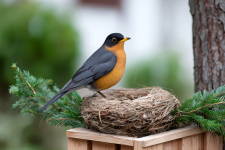 American robin standing on a bird nest with green pine branches