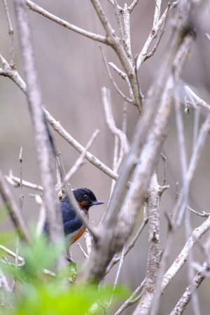 Black throated Flowerpiercer (Diglossa brunneiventris), perched and hidden among the dry branches of a bush.
