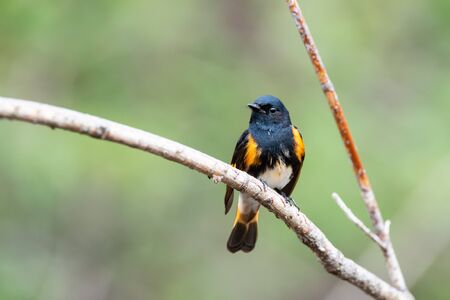 American Redstart perched on a branch during spring migration in Wisconsin.