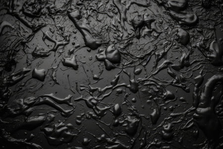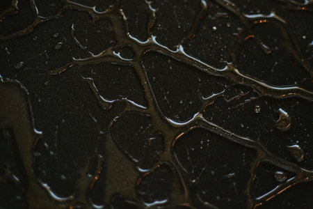 Close-up view of a dark puddle of liquid displaying a glossy finish, with subtle reflections and delicate water droplets on an abstract surface.