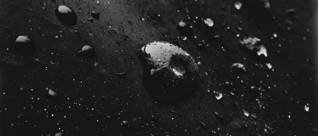 Water droplets on a dark surface, forming intricate textures with reflections, ideal for high-contrast, minimalist photography