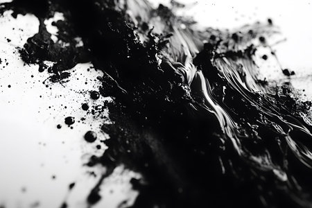A striking abstract image featuring dynamic splashes and textured flows of black paint over a white background. this artistic composition showcases movement and contrasts, ideal for creative design projects, posters, or modern decor. Generative AI
