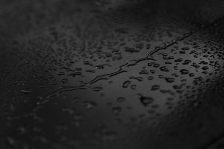 Water droplets on the metal surface in black color in close-up view, selective soft focus.