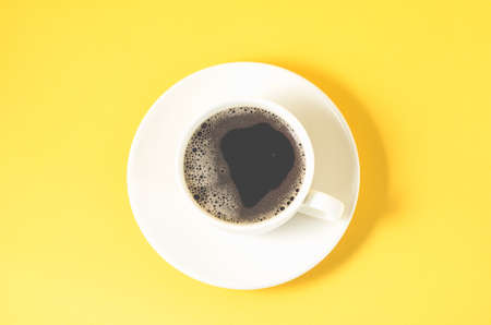 white cup with a saucer on a yellow background / white cup of espresso with a foam on a yellow background, top view