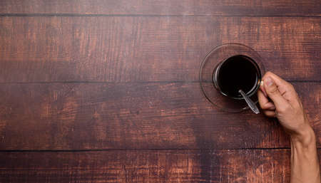 Top view,Hot coffee cup on glass cup on wooden table background.