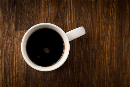 White cup of coffee on vintage wood. Top view.