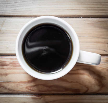 Top view of a brown hot coffee cup on an old wood table vintage style with light nature