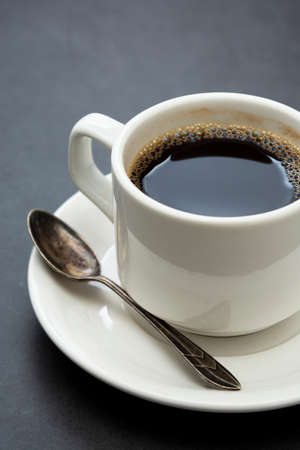 Coffee drink. White cup of coffee top view spoon and plate on dark background
