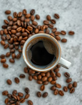 top view cup of coffee with scattered coffee beans
