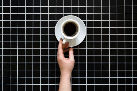 Caffeine and sleep problems. Drinking coffee before bed. A cup of black coffee on black checkered background