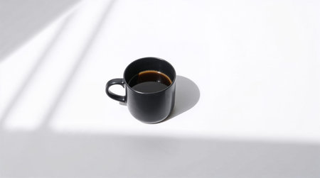 Minimalist photograph of a matte black coffee cup against a pristine white background. Bold shadows define the cup's shape, emphasizing its texture and the subtle sheen of the coffee.