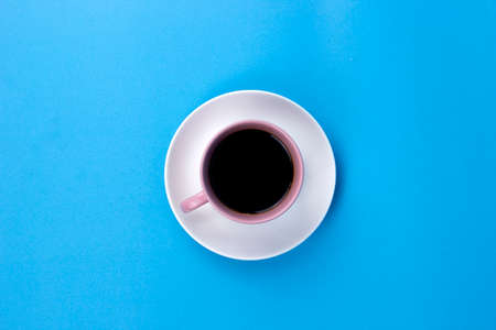 White cup with black coffee on a blue background. Morning breakfast.Empty space for the text. Minimalistic photography.
