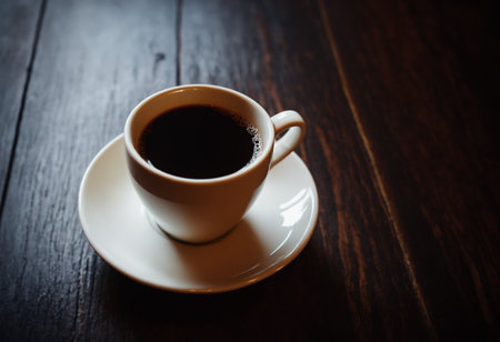 white coffee cup with black drink on wooden table