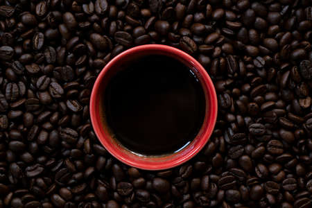 Coffee cup on Coffee beans texture background. Top view