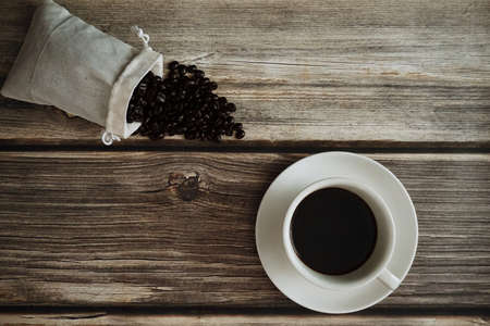 Coffee cup with coffee bean on wooden table view from top