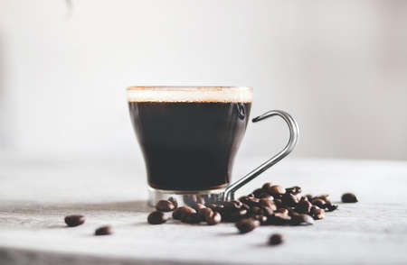 Glass of Black Coffee and roasted coffee beans on the wooden Table