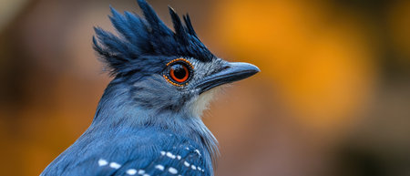 This captivating image features a close up of a blue bird with striking orange eyes and distinctive feather patterns. The bird is perched allowing for a detailed view of its sharp beak and intricate plumage. The warm hues of the background create a beautiful contrast highlighting the birds vibrant colors and unique characteristics