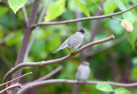 A female Eurasian Blackcap sitting in a bush, cloudy day in springtime, Vienna (Austria)