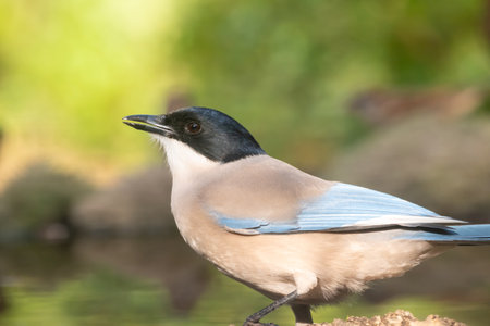 Beautiful close up side portrait of an Iberian magpie with its beak open and background out of focus, near Cordoba, Andalusia, Spain
