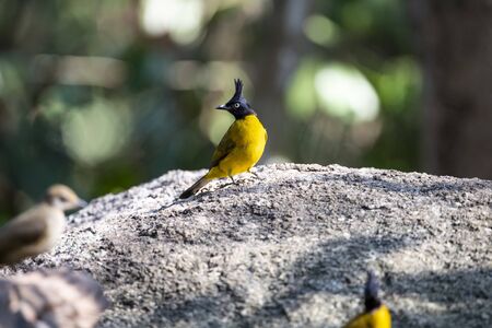 A black - crested bulbul is perching on a rock and staring with its pale eyes.