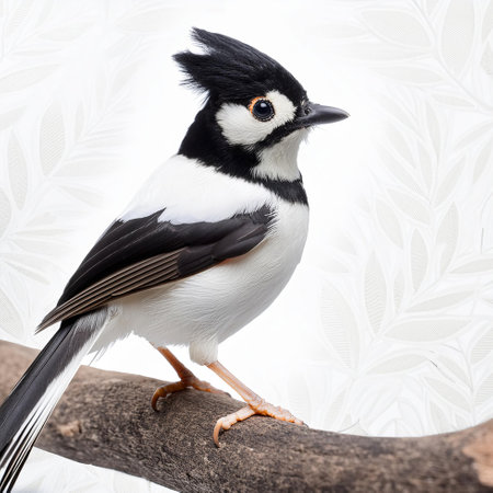 Black and white bird with a comb on its head sits on a tree branch on an abstract white background