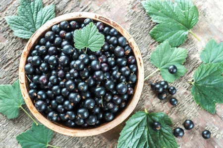 Fresh black currants bowl top view on rustic wood background. Natural organic berries with green leaves scattered on weathered grey wooden table, dark filter