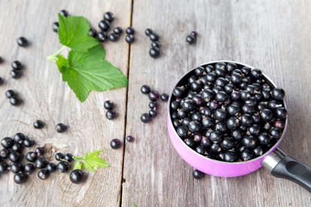 Fresh black currants showcase their rich color and texture on a wooden table, accompanied by green leaves, perfect for culinary uses and healthy recipes.