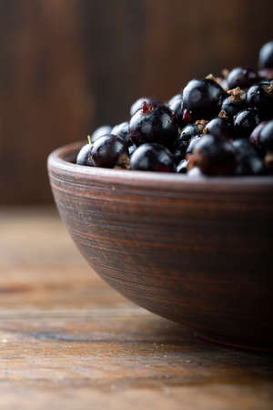 Fresh ripe organic black currant in plate on wooden background. Selective focus, rustic style.
