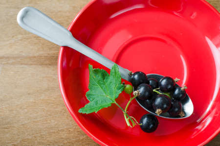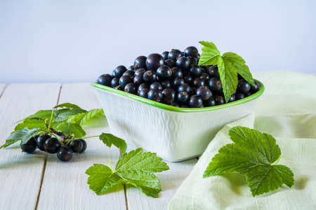 Fresh berries of black currant in a plate on a table. For a diet and saturation with vitamins