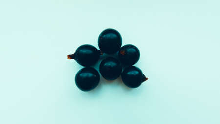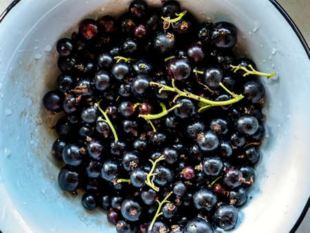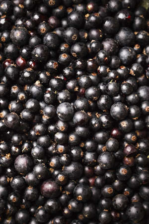 Fresh black currant background. Top view. Close up of fresh black currants background. Healthy food concept. Beautiful selection of freshly picked ripe black currants.