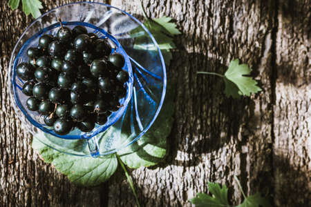 Black currants in a glass bowl. Rustic wooden table. Ripe forest berries on the table.