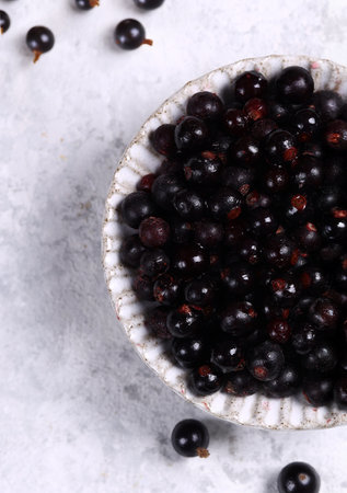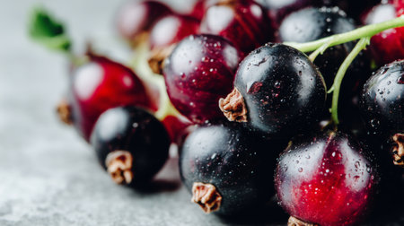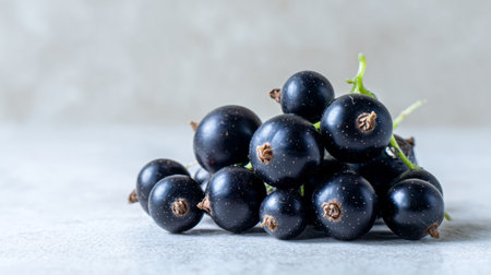 Discover the delectable beauty of fresh black currants, showcasing their rich color and texture against a soft gray background. Perfect for healthy recipes.