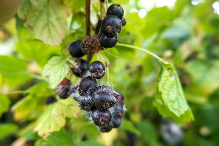 Spoiled moldy black currant berries on a bush in the garden. Bad and rotten harvest in rainy summer.