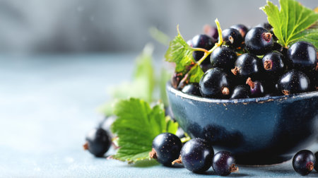 Vibrant blackcurrants glisten in a dark bowl, surrounded by green leaves. This image captures the essence of fresh, healthy ingredients perfect for culinary creativity.