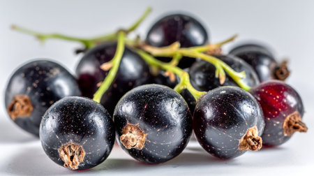 A closeup of fresh blackcurrants against a white backdrop, highlighting their juicy texture and rich color, perfect for promoting health, nutrition, and culinary uses.