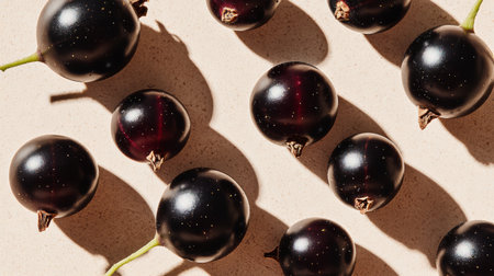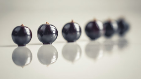 A stunning arrangement of fresh dark purple berries creates a minimalistic and elegant composition, highlighting their smooth texture and vibrant color against a reflective background.